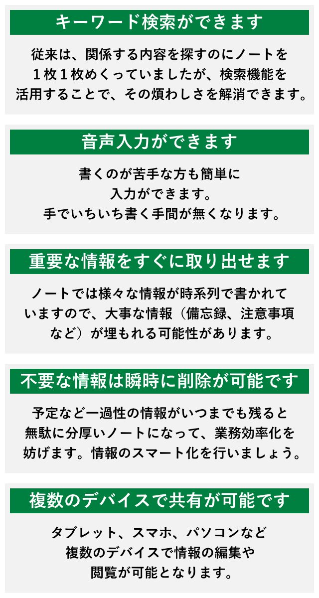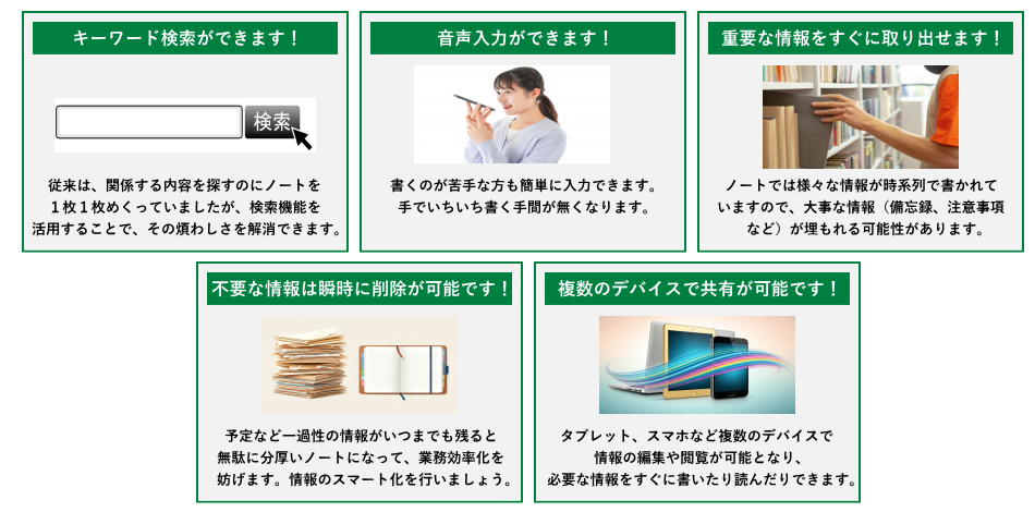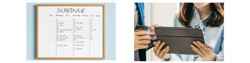 ホワイトボードに手書きで書かれた予定表、紙で印刷された連絡表などをタブレットに集約し、いつでもどこでも閲覧することが可能となります。